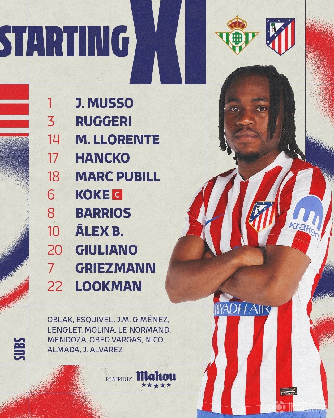 马竞客战贝蒂斯:格列兹曼、小西蒙尼首发出战,卢克曼首秀
